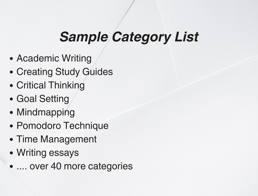 Topics include: Avoid Procrastinating, Citation and Referencing, Exam Time Management, Managing Test Anxiety, Problem Solving, Time Management and more! Over 50+ Categories.